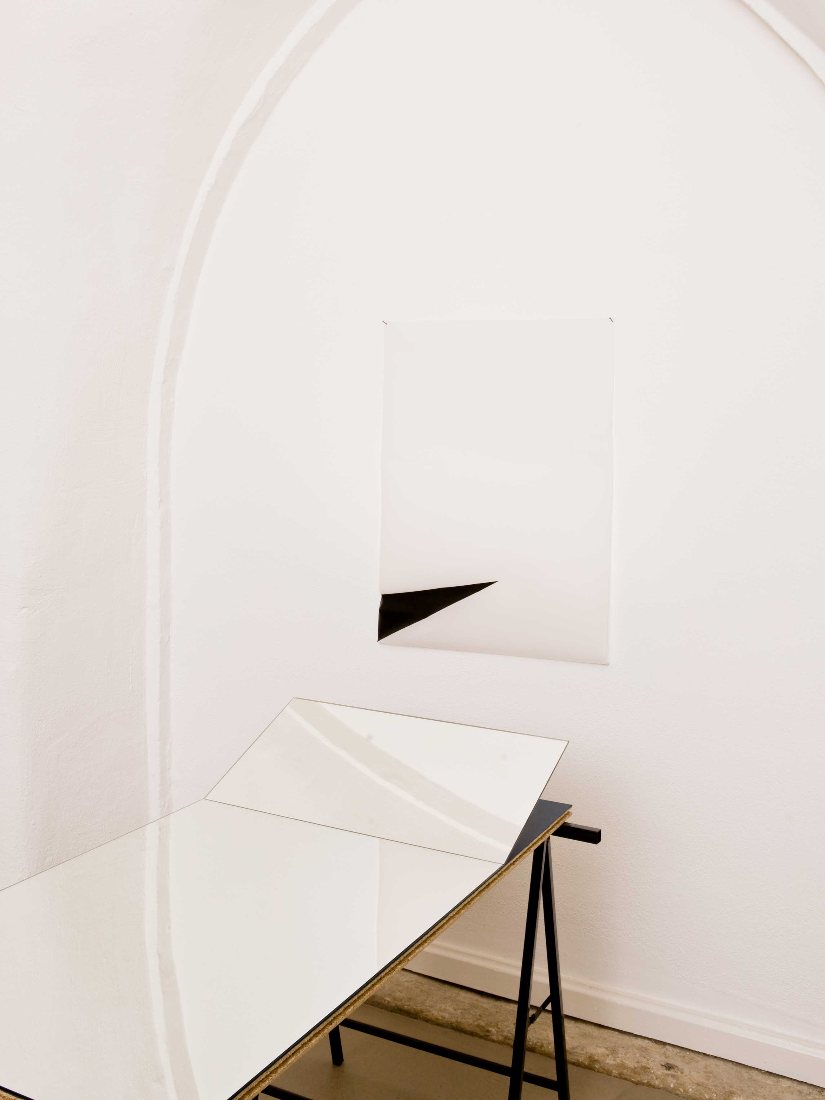 Keiner der Räume unterliegt einem Entwurf. Sie fügen sich im Arbeitsprozeß aus einzelnen Raumelementen, wie Türrahmen, Bodenbelägen und verschiedenen lackierten Holzplatten zusammen. Dieser Vorgang ist von Aussen offensichtlich erkennbar, der erste Blick erfasst eine Aneinanderreihung diverser, oft gebrauchter »Reststücke« - Regalböden, Tischplatten/ Unterlagen etc.